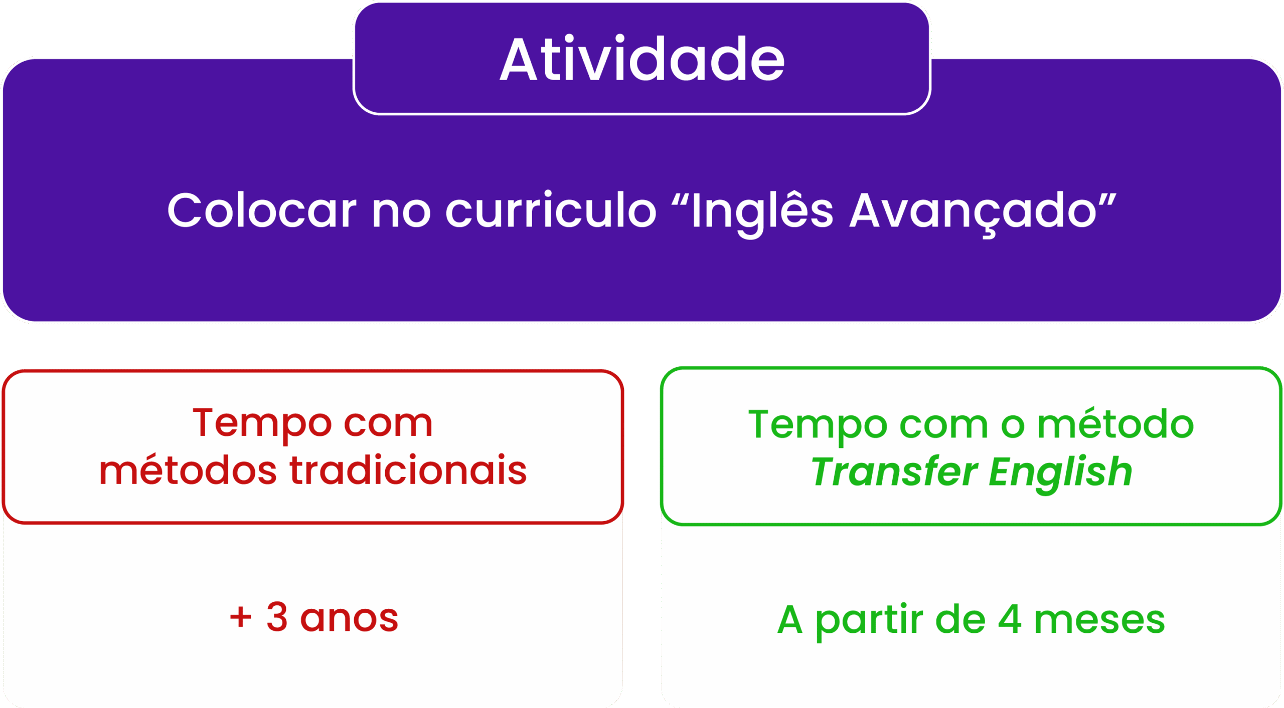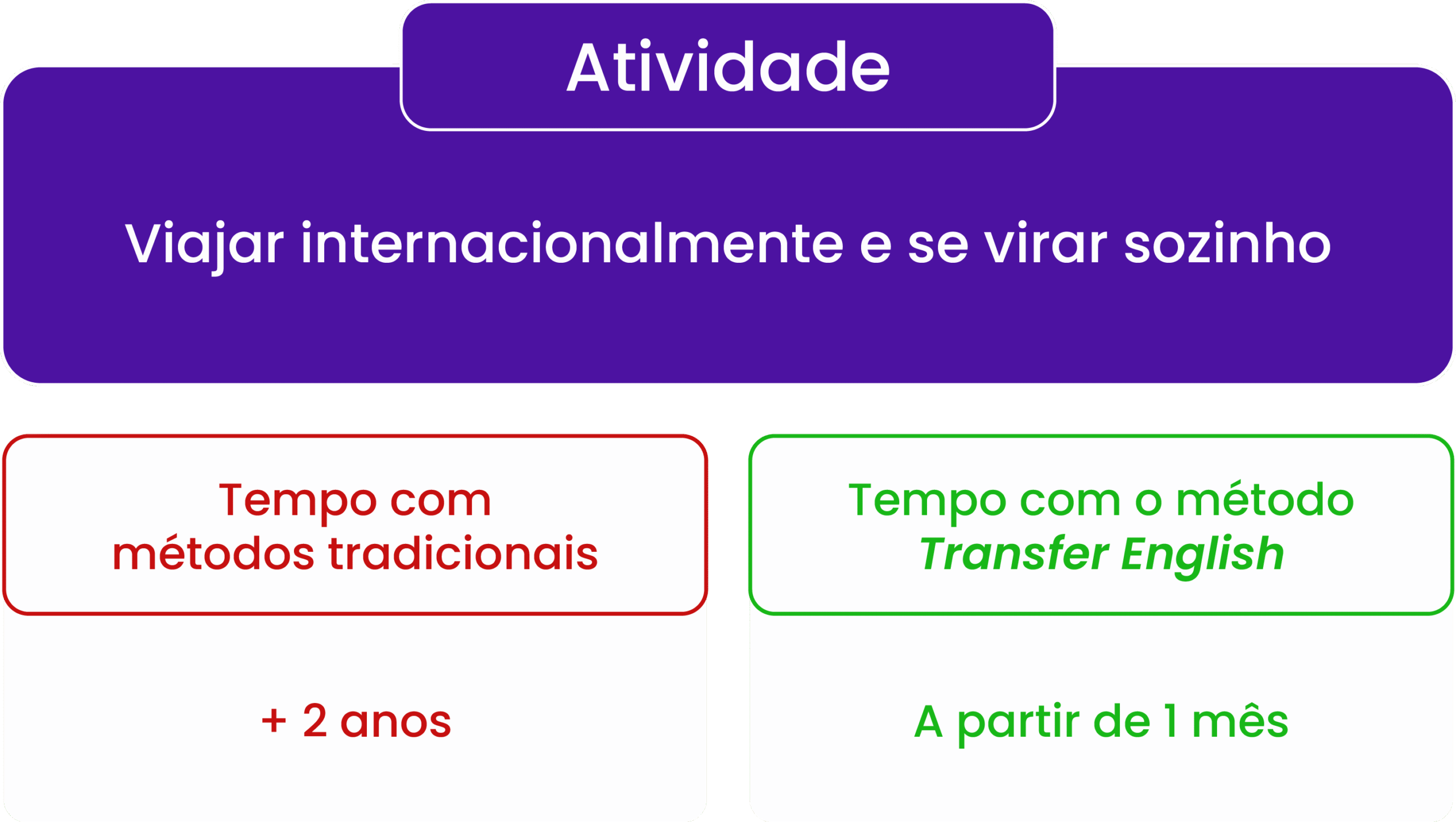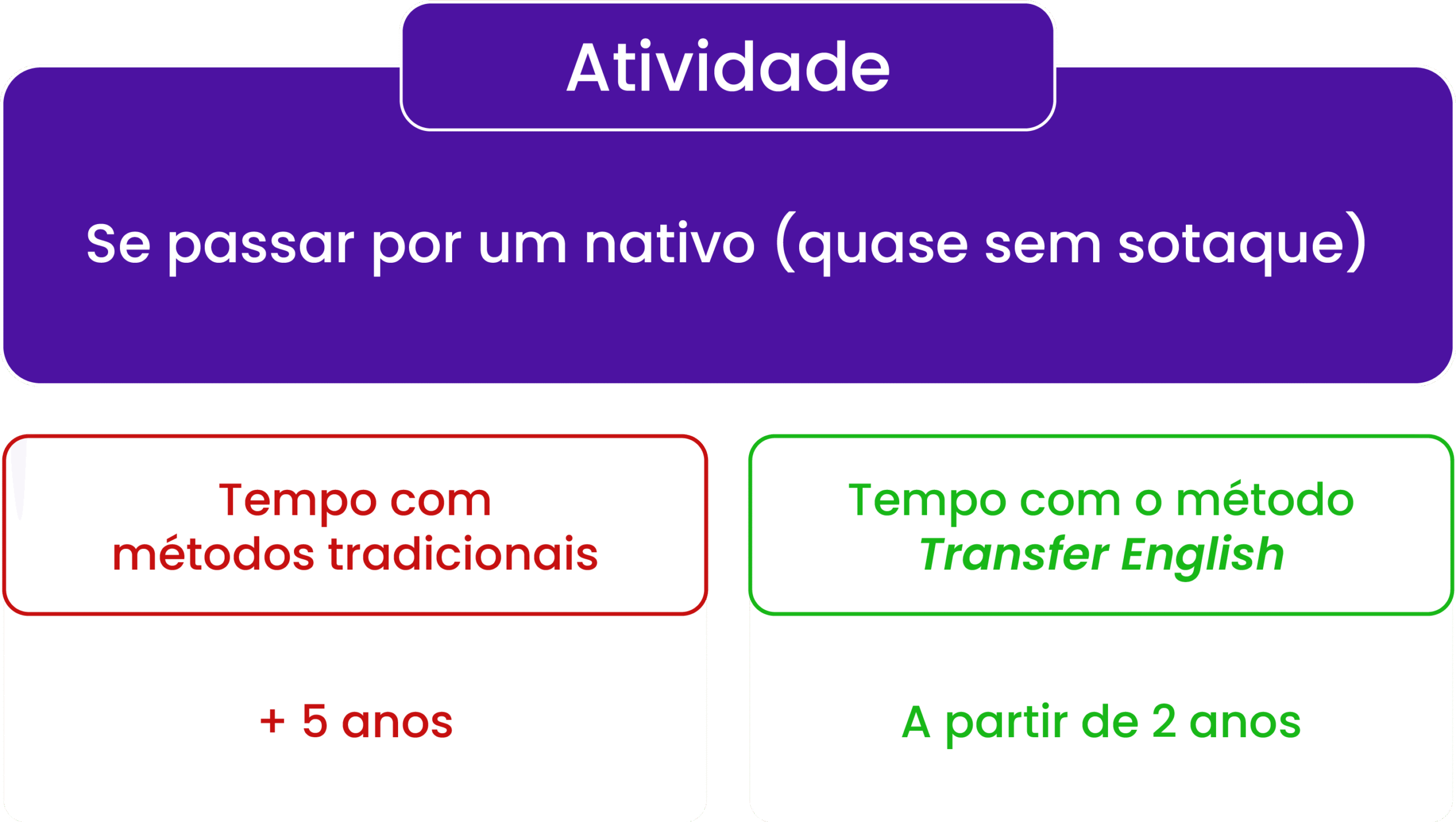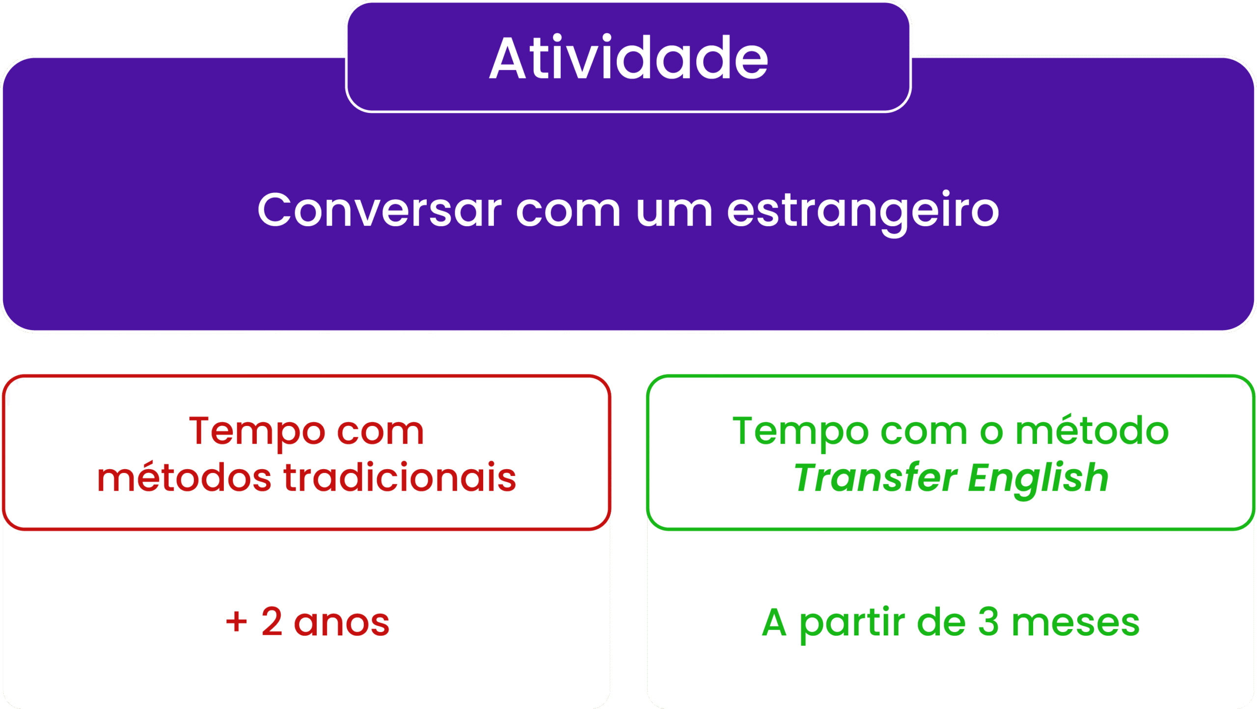 Por conta da Transferência Linguística e dos 5 pilares do método Transfer English, você pode aprender até 10 vezes mais rápido do que em relação a métodos tradicionais.